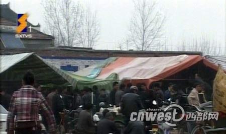 上午11点,周至县二曲镇张家村的庙会现场人山人海,非常热闹。会场北边的一排简易帐篷前更是人气旺盛,记者走近一看,发现每个帐篷里都聚集着四五十人。台上的庄家正摇着骰子,台下的人正纷纷地下着赌注。