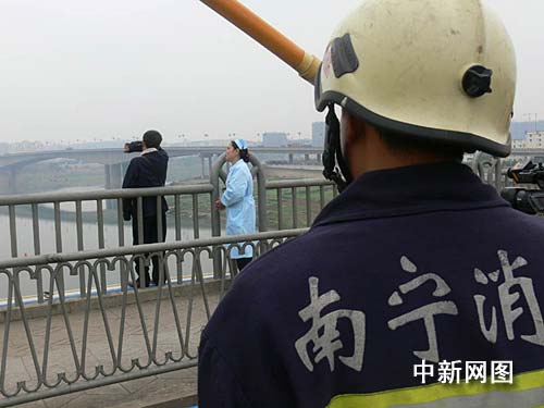 中新网南宁3月8日电(吴斐雄 王刚)今天中午,广西南宁市白沙大桥上,一名男子站在白沙大桥往江北大道方向的桥带护栏边缘,正准备跳桥自杀。南宁市消防特勤一中队接到报警迅速出动,巧妙运用战术,瞬间出手救下自杀男子。
