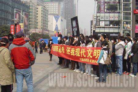 昨日下午,一声声“抵制陈冠希,还我现代文明!”的口号从(成都)香槟广场传来,吸引了大批市民围观。50多个戴着白口罩的年轻人在广场上整齐地排成几排,站在第一排的年轻人还拉起一条10多米长的“万人抵制陈冠希,还我现代文明”红色横幅。在喊口号的同时,还不时有人在横幅签名。这群年轻人正是“中国反明星成都分会”的会员,正在搞一个“反对明星万人大签名”的活动。据了解,这次活动是今年全国“反明星”活动的“开幕战”,随后,全国各地都将举行各种“反明星”活动。他们称,一旦有“明星大事”发生,他们就将随时“公开抗击”。