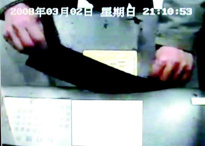 再看录像,此男子还有一名穿深色衣服的同伙在附近“望风”。只见“深色衣服”随后走近ATM机,看到出钞口的黑色塑料片没有装到位,就从身上抽出一把小剪刀,把黑片修剪整齐,好让取款人看不出破绽。