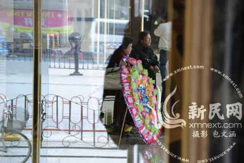 3月11日上午9点30分左右,新民网记者在中亚饭店看到,跳楼男子的家人仍聚集在中亚饭店的大堂内,中亚饭店大堂内的显著位置已经设有灵堂,大堂内摆放着祭奠用的台子,祭台旁边摆放着2个花圈,死者的亲人在祭台前焚烧纸祭奠死者。