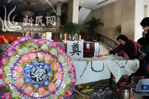 死者的亲属在酒店内摆设的灵堂 包文涵 摄