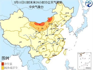 中新网3月11日电 中央气象台今天上午十时继续发布沙尘天气预报:受东移冷空气影响,预计今天中午到明天中午,甘肃河西走廊、内蒙古中西部、宁夏北部、陕西北部等地有扬沙或浮尘天气,内蒙古中西部偏北的部分地区有能见度小于1000米的沙尘暴。