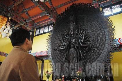 龙泉石经寺内雕成的东南亚最大乌木千手观音,所用乌木据测已有7000年历史。昨(11)日,这尊千手观音首次亮相,展露祥容。本月22日,石经寺将举行盛大开光仪式,(四川)省内外高僧大德云集,并进行学术研讨,乌木千手观音将正式向游人开放。