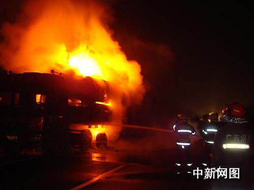 当晚10点35分许,乳源消防中队接到报警后,立即两台水罐消防车和13名消防官兵,与交警、路政等部门先后火速赶到现场进行灭火。