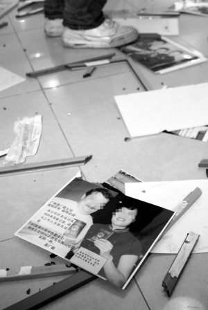 易广联会客室桌椅被砸坏,资料照片散落一地。
