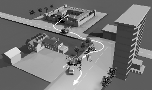 保定监狱→军校广场:1.开着吊车冲破监狱三道门。2.连撞4辆车。3.弃车逃跑。 新京报制图/丁华勇
