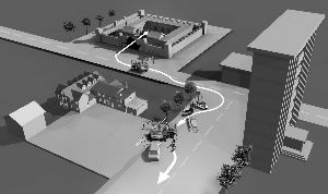 从监狱门口到谢万礼弃车逃跑地点大约有1500米距离。在军校广场东侧的便道上,还有两棵树被连根撞断的痕迹,一家网吧的收银员证实,吊车开到军校广场东北角后,继续向南行驶,但连续撞了4辆轿车后冲上便道,撞断了两棵树,随后丢下车逃走了。