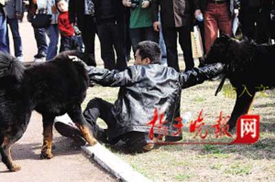 上午9点30分,两条来自浙江丽水的1岁大藏獒不知是等比赛上场等得不耐烦,还是人多天热烦躁,突然互相撕咬肉搏起来,“獒主人”情急中双手执獒绳劝架,但两獒不听,发起飙来,肥硕的身体将主人摔倒,并拖地猛拽出5米远。后在众人帮助下,向藏獒喷水降火气后才平息。