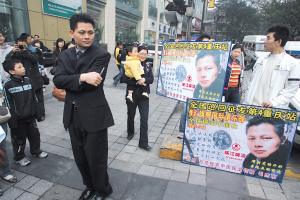 昨日下午2时许,记者在解放碑步行街看到西装革履的毛杰东以及他的三个“征友牌牌”,征友牌约1米长、70厘米宽,上面印着毛杰东的大头像,一旁写着“中国摇滚领袖毛杰东——全国巡回征友第四站重庆站征友:范冰冰的外形、徐静蕾的才华、林志玲的可爱、杨慧妍的财富、一千万到一亿的资产”等字样。三名男青年举着牌子在步行街游走,毛杰东则洋洋得意地走在最前面指挥。数百市民围观。