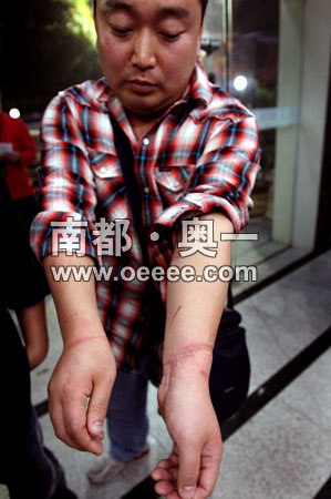 今日4时45分,马小六被铐近两小时后,在黄贝派出所所长刘臣建的指示下,该所警员将手铐打开。今日上午,多处受伤的南方都市报记者马小六被鉴定为轻微伤。(高爽)