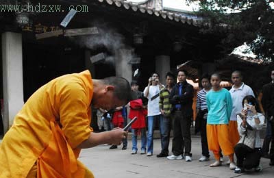 事件实录:“哇,铁条断了、三根都断了!”,在泉州南少林寺大殿广场前,围成一圈的观众群中响起了一阵阵惊叹声。几分钟前,在众多媒体及游客面前,泉州南少林寺弟子释振明在短暂的凝神运气后,用头撞向铁板。一撞之下,三条规则叠放在一起、半米长、总厚度达1.5厘米的铁条瞬间碎成了四五截、飞出四五米开外。在这一手高超的“铁头功”面前,几位小朋友惊奇得连嘴都没合上。
