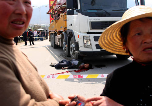 上午12时30分许,记者赶到现场,看到一辆黄色的混凝土输送泵车被人群包围着,一位身穿黄色制服的交通征稽执法人员,坐在驾驶室里趴在方向盘上一动不动。记者挤进人群看到,一位中年民工躺在车的右前轮子前面的血泊中,人已经死亡。周围的群众、游客情绪激动,指着车上的执法人员骂声一片。