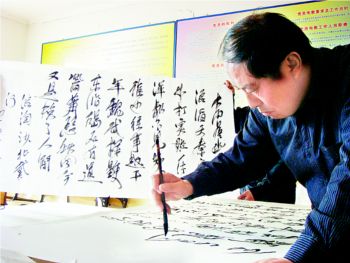 昨天,记者在延庆县延庆镇米家堡村见到了49岁的张海河。操着浓重延庆口音的他告诉记者:“我只有初中文化,识字不多,先是种地,后又做建筑安装,没想到老了老了,还能练书法,让乡亲们觉得我是个文化人!”