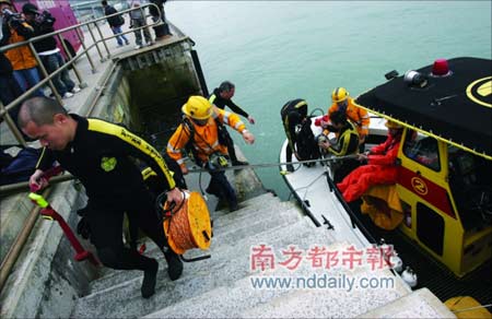 昨日下午1时30分,经过10多个小时的奋战,蛙人上岸补充物资。霍健斌摄