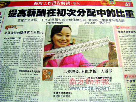 这张个税为0的工资条图片源于3月6日广州一家报纸。当时正值全国“两会”,企业职工薪酬问题受到了人们的普遍关注,而且从今年3月份开始,个人所得税的起征点由1600元调整到2000元。该报纸以“收入”为关键词在A7版做了半个版的政府工作报告解读,并特意采用了一张工资条的特写照片作为插图,而正是在这张图里,工资所得者的个人所得税一栏显示为0.