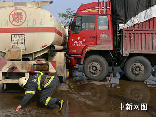 中新网南宁3月27日电(胡明军 王刚)3月26日下午15时35分,广西南宁市清川大桥往大学路方向的十字路口,一辆急速行驶的油罐槽车被一辆大货车撞击,造成油罐槽车内的柴油泄漏地面,严重威胁着过往车辆的安全。