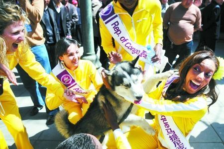 看到寺门前突然多了这么多异国美女,游客立刻把美女们围了个严严实实,站在外层的游客踮起脚尖伸长脖子往里看。