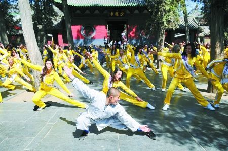 旅姐们对少林武术非常仰慕,纷纷要求少林武僧教她们几个简单的招式