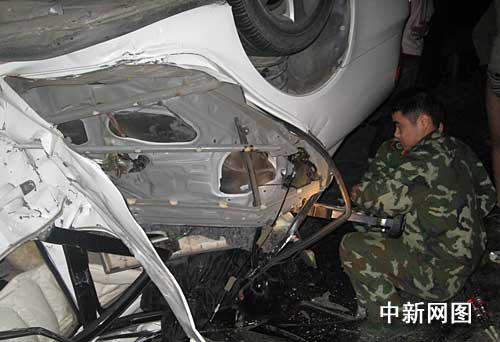 消防官兵正在现场进行救援,破拆严重变形的车门。
