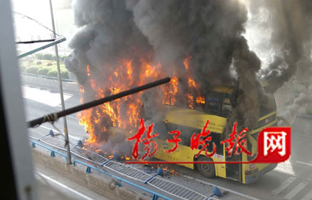 昨天上午7时55分,一辆双层100路公交车在南京市雨花西路高架桥沿线尾部发生自燃,浓烟升腾数十米。时值上班高峰,公交车内有乘客60多位。一骑车上班的市民发现火情后,奋追100多米,向驾驶员通报火情,随即司机停车并及时疏导乘客,后因火势太大,公交车瞬间成了“火”车,还危及地铁中华门站10多米高正在运行的地铁线。随即,消防官兵赶到现场,扑救大火。整个过程中,没有乘客受伤。但是大火将公交车烧成了一个空壳,烤化了附近的店家门面招牌,熏黑了地铁栅栏,道路旁的植物也被烤死。