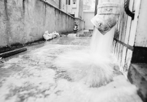 左图:顶楼住户用消防水带将水箱漏的水引至排水口处。下图:白花花的自来水从排水管昼夜不停地灌下来。 (记者唐煜 实习生李俊青)