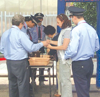记者在现场看到,由于派出了大量人力积极进行疏导,人们沿着制定好的线路鱼贯前往入口安检处和海外采购商证件办理处,尽管有时人流行进缓慢,但总体上并没有出现滞留现象。所有进出展馆人员的出入证都前所未有地印有防伪标志,照片也都是电脑打印上去的,防止不法份子更换照片,所有出入者都将通过“民航式”安检:即参会人员进入广交会展馆,必须持有进馆证件并随身携带护照或身份证以备现场查验;民航禁止携带的液态物品、打火机、火柴等物品,一律不得带入展馆,进入控制区的所有车辆,也全部实行安检。