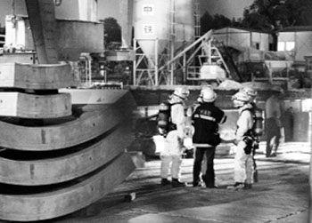 消防防化人员在地铁工地入口处等待进入现场。