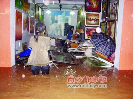 “水深的时候,洪水已经淹到我胸口了。”大芬油画村一身高近1米8左右的画匠宿先生红着双眼告诉记者,19日晚8时左右他接到了油画村相关管理部门的电话,可因为狂风暴雨,路面大塞车,车开到布吉镇政府时,他舍车小跑到画廊,趟着齐胸高的洪水赶到了画廊。“宿先生说,他看到所有的水彩画都泡在水里。