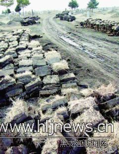 18日,在当地村民带领下,记者来到了位于沾河林业局苗圃西侧的龙镇村这片草原。沿途记者看到,一摞摞草砖整齐地堆放在路两侧。“这都是从草原上挖来的,还没来得及运走,”村民贾仁军说,“从去年9月份开始,30多人在草原上挖了有两个多月。”