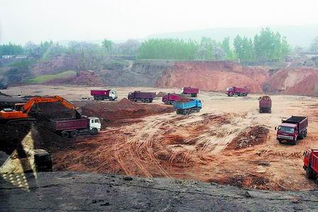 4月18日,记者来到现场,在西施煤业公司东南角约100米处,记者看到,一个长宽上百米,深20米的巨大露天采坑内,数台大型挖掘机和十几辆大卡车正在紧张忙碌地作业(如图)。采坑东部的挖掘机挥舞手臂,将从坑壁挖下来的土装进卡车,随即这些土便被运往采坑西侧进行填埋。在采坑的东南角及西侧边缘,麦苗裸露在新鲜的泥土外,尚未被挖掘的地表已经出现裂纹,绿油油的麦苗生长在夹缝中,岌岌可危。而西南侧的深坑中,黑糊糊的煤层清晰可见。据当地一名知情群众讲,这个露天煤矿已经开采了有两年时间,把麦田和树木都毁了,群众有意见,煤矿就赔点钱。虽然是有群众向登封市国土资源部门投诉,但一直没有被查处。“最近听说国土资源局来查了,才停止了露天挖煤。”