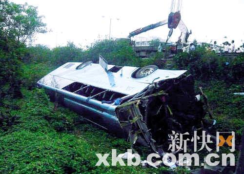 昨日上午,一辆粤港直通大巴从广州中国大酒店出发,经广深高速前往香港湾仔,9时13分在东莞厚街白濠路段,与一辆货柜车追尾后失控,撞破路边护栏坠入十多米下的排水沟,车上26名乘客不同程度受伤,其中部分是刚参加完广交会的外籍客商,大巴司机麦某重伤后送院抢救,于下午5时不治身亡。受事故影响,该路段交通堵塞4个多小时,被堵的车龙长达5公里。经现场勘查,初步怀疑大巴车速过快导致车祸。