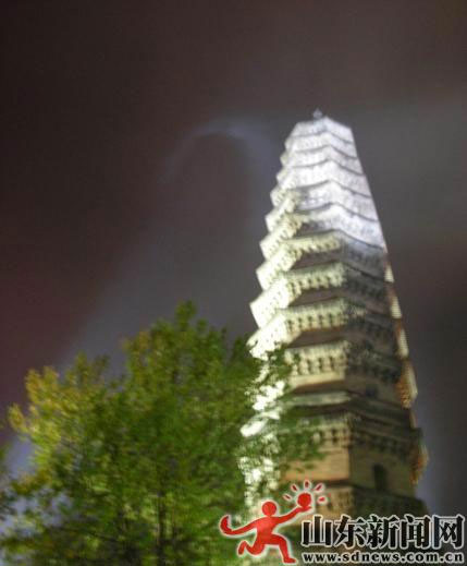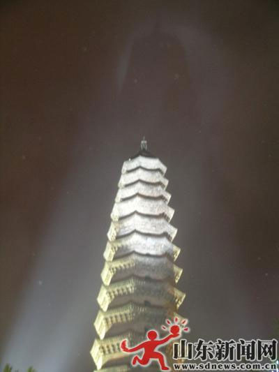 4月20日即农历的三月十五,适逢第五届汶上太子灵踪文化节开幕第四天。当天夜间19时左右,淅淅沥沥的小雨转为蒙蒙细雨,景区上空飘动着香火缭绕而成的烟雾,太子灵踪塔上空出现零星飘动着的云彩,在宝相寺景区景观灯的衬托下形成一道天幕。突然,游兴正浓的游客惊奇地发现“天幕”上出现了太子灵踪塔塔影,佛塔蜃景的塔尖非常清晰,在影塔塔尖四周的烟云形成一道白色光圈,吸引了不少市民和游客前来观看拍照。