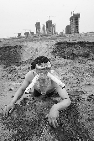 昨日,干涸的潮白河床,一名艺术家头戴自制的万花筒面具爬出沙坑,透过万花筒他看到一个与钢筋水泥不同的世界。记者 周晓东 摄