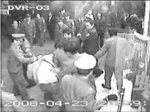 据录像资料显示,当晚8点58分20秒左右,在收银台前,被城管人员围攻的王骐尝试自卫,还手打了其中一名城管人员。其余几名城管人员见状,一起扑上来,有的按住他的脖子,有的扯住他的衣服,有的挥拳打上去。但寡不敌众,仅几秒钟,五六名城管人员将王骐控制住,将其拖出小店。