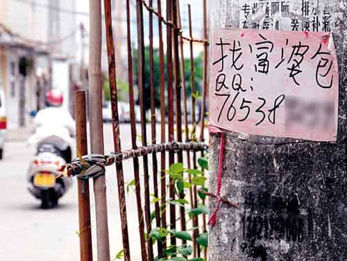 日前有阳江读者向记者报称,在阳江市区东风路国际花园的一个路口,有男人贴出一张特别的广告,上面写着“找富婆包”,并留下了QQ号码。记者闻讯来到上述路段察看,果见其然。