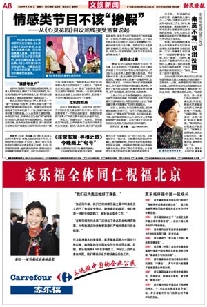 记者发现,4月27日出版的上海《新民晚报》A8版上有半版内容是家乐福“祝福北京,支持奥运”的宣传广告。此广告通栏标题为“家乐福全体同仁祝福北京”字样,并在文字中强调“我们已为奥运做好了准备”。此广告更是用一位中国员工的笑脸来打动读者,称“永远做中国的企业公民”。
