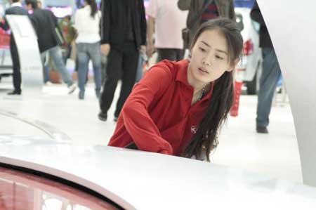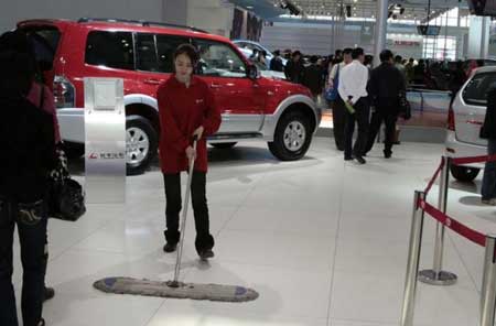 接下来的事情让摄影者几乎落泪:清洁妹妹在为轮胎抛光,当时展台上的模特正在走秀,台下很多专业的摄影家们在忘我地拍摄着,她蹲着从底下擦过来的时候,似乎阻挡了他们的创作,一个摄影家为了捕捉到那珍贵的大腿,冲上来,伸出大手拉了她衣服领子一下,她趔趄了一下,然后很不好意思地躲开了,从照片上看,妹妹仍然尽职地擦着车,但紧闭的双眼、微蹙的眉头让人能一眼看出,她心里很不好受,这张楚楚可怜的照片,令人对其顿生同情和怜爱。