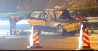 工人们正在封闭区域内作业时,惨剧突然发生。一名工人说,突然,一辆出租车穿越他们设置的路障,重重地撞到小货车上。