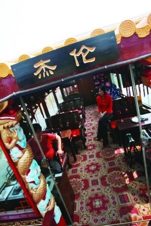 昨天记者先睹为快,原来当初周杰伦乘坐的“聚宝号”已换了船名,船头赫然挂着“杰伦”二字,十分惹眼。据有关工作人员介绍,这条船比普通游船宽出半米,两侧有彩绘的木龙,船身由木头制造,飞檐朱栏,古朴典雅。船内的设施十分考究,红木椅子、茶几。船头有能点歌的卡拉OK,船尾还有卫生间。属于贵宾船,一般轻易不开出来,只供给重要领导使用,而上次周杰伦游秦淮河,正是乘的这艘画舫。