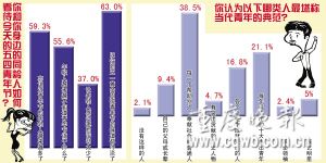对“过青年节”,32.7%的人抱无所谓的态度,32.6%的人表示不喜欢过青年节,他们认为这个节日只是停留在名义上的传统节日,诸如讲座、演讲之类的纪念活动毫无吸引力。