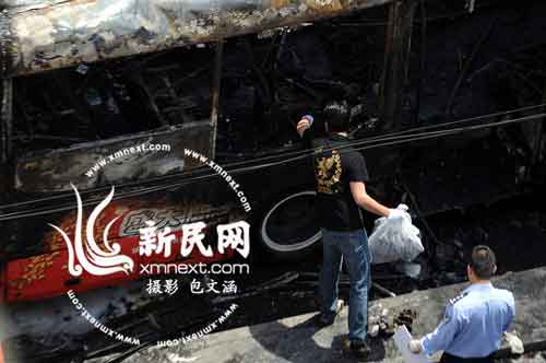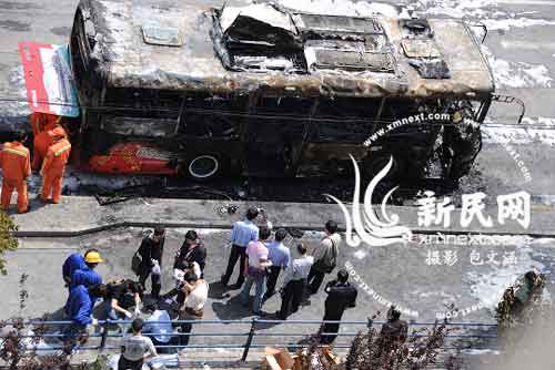 842路公交车爆燃的现场新民网 包文涵摄