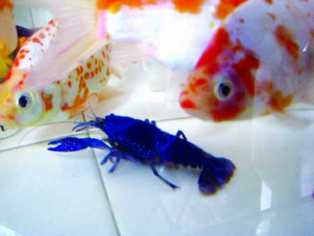 然而,由于这只龙虾穿着罕见的蓝色“盔甲”,与旁边的红色龙虾形成了鲜明的对比。它看起来很活泼,在鱼缸中和观赏鱼一起嬉戏,红的金鱼、蓝的龙虾构成一幅漂亮的画面。