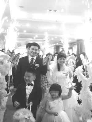 中午12时30分,婚礼正式开始。叮叮和小伙伴一人手提一个装满花瓣的小花篮,在玫瑰花亭下站好。当主持人宣布新人入场时,两人相对而立,随后带领新郎新娘缓缓踏上红地毯。叮叮右手提着花篮,左手抓起一把玫瑰花瓣,用力向空中撒去,始终笑呵呵的,直到把新人带到婚礼主舞台。这时,伴娘送上一个“仙女棒”,“我是爱神派来的小天使,我来唤醒你们的爱情……”叮叮拿起“仙女棒”,踮起脚尖走到新郎新娘面前,朝新人手中的水晶球轻轻一点,只见水晶球里蓝光四射,现场掌声一片。