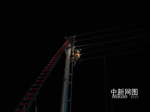 消防队员到达现场后才发现是一名小偷因偷高压线,被困在电线架上,人已经没有生命迹象。公安行侦大队、派出所、电力先到场后都无能为力,需要消防救援。消防指挥员通过观察现场和询问电力部门技术后,马上出了一套方案用15米金属拉梯救人,拉梯马上起架,同时用抢险救援车照明,但由于地面有落差,拉梯不好起架,第一套方案结束。这时电力部门在旁边建议,可以用高压电线杆的攀手到达目的地救人,但电力部门人员又没有能力上去。消防接受任务后,马上决定派出两名优秀的消防队员上去营救。但由于距离比较高,又担心高压电,指挥员决定亲自上去营救。