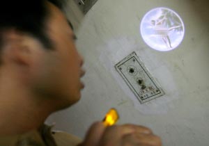 打火机尾部的灯光射在墙上现出裸女投影 记者韩亿国/摄