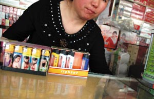 “老板,打火机多少钱一个?”记者试探着向店里的一位中年妇女询问价格。“单卖2元一个,如果你要的多,可以便宜点给你。”中年妇女称如果一次购买50个打火机,单个以1.5元出售。记者以批发大量打火机为由,想让店铺老板说出直接联系打火机制造厂商的方法,但中年妇女担心生意被抢,坚决不肯透露任何信息。“你们要买可以先付订金给我,我打电话给卖火机的人预定,你们要多少都可以。”店主说艳照打火机也是最近才进的货,还比较好销,生意好的时候一个月能卖出50个左右。看记者拿着火机观察了一阵并没有购买的意思,店主开始有些警觉起来,打算将装有艳照打火机的盒子收起来。“如果想批发可以来找我。”
