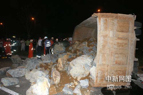在事故现场,记者看到一辆满载石头的工程车侧翻压在一辆面包车上,地面撒满了玻璃碎片和石头,面包车严重变形,2名人员被困,其中一名女子经现场救护人员诊断称由于失血过多已死亡,另一名被困人员被压在了工程车下面,不能动弹,生命垂危。
