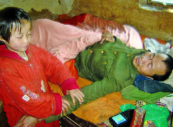 小秋伟的父亲马怀福瘫痪在床,他躺在靠近窗户的一张床上,脸庞黄瘦,双手瘦得只剩下一层老皮,身上盖的棉被有四五处露着棉絮。