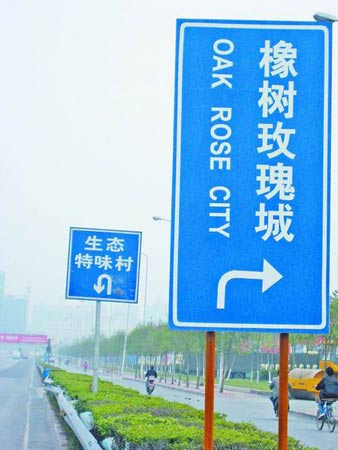 在郑州市中州大道与南三环交叉口附近,记者先后看到两个酷似交通路牌的广告牌。蓝色牌子上,分别写着“橡树玫瑰城”和“生态特味村”等字样,而且都有白色箭头指示方向。